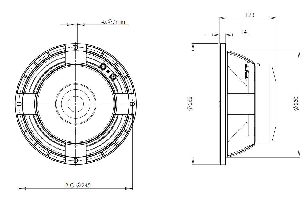 B&C 10PS26 ist ein 10-Zoll Woofer für kompakte, belastbare Zwei-/Drei-Wege-Systeme. Der Ferrit-Antrieb mit 76-mm Aluminium-Schwingspule, 18-mm Wickelhöhe, 10-mm Luftspalt sowie Kurzschlussring (Copper Cap) sorgt für saubere Mitten und erweiterte Hochtonwiedergabe. 350 W AES / 700 W Programm, 96 dB und ein Arbeitsbereich von 55–4000 Hz liefern hohen Nutzpegel bei moderater Einbautiefe. Empfohlenes Bassreflex-Gehäuse: 25 dm³ mit 65 Hz Tuning – ideal für portable Tops, Near-/Front-Fills und Installationen.