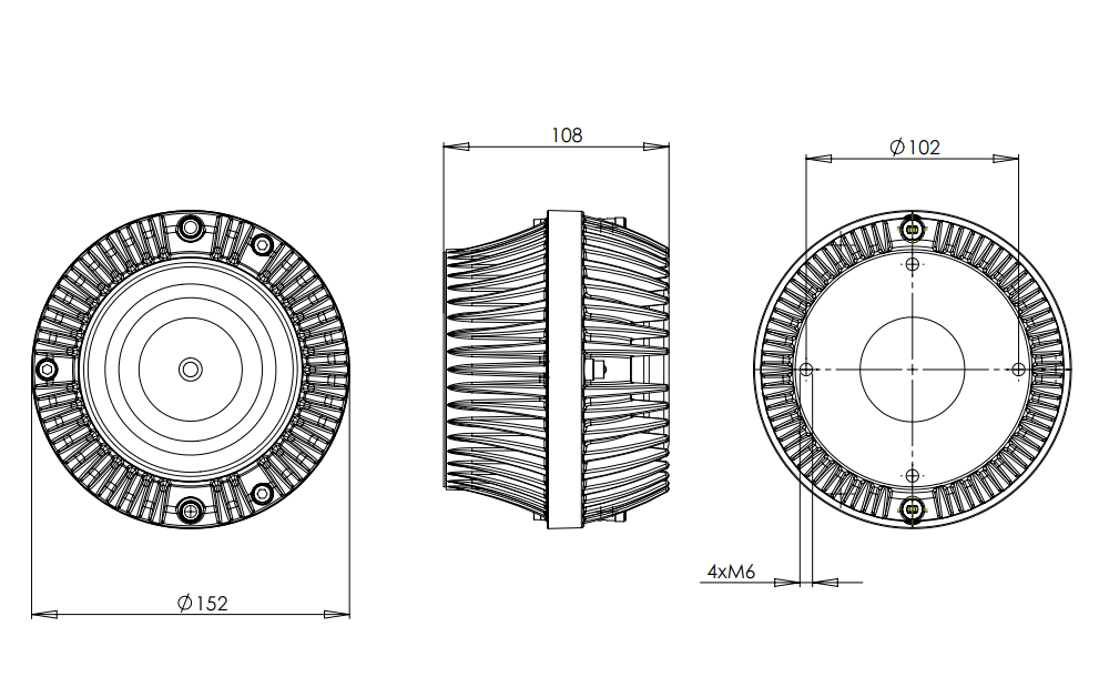 Der DCM50 von B&C ist ein 2-Zoll-Kompressionstreiber für den Einsatz an Hörnern, ausgelegt auf saubere Mittelhochton-Übertragung in professionellen Beschallungssystemen. Das Neodym-Magnetsystem liefert hohe Flussdichte bei kompakter Bauform; der 50-mm-Hals und die 51-mm-Schwingspule mit Aluminiumwicklung arbeiten mit einem Composite-Diaphragma. Die Nennbelastbarkeit liegt bei 80 W, Programm 160 W. Empfohlene Trennung ab 0,4 kHz, Arbeitsbereich 0,4–10 kHz, typische Empfindlichkeit 108,5 dB. Der DCM50 passt per 4× M6 auf 102-mm-Lochkreis und ist mit 152-mm-Gesamt-Ø und 108-mm-Tiefe gut integrierbar.