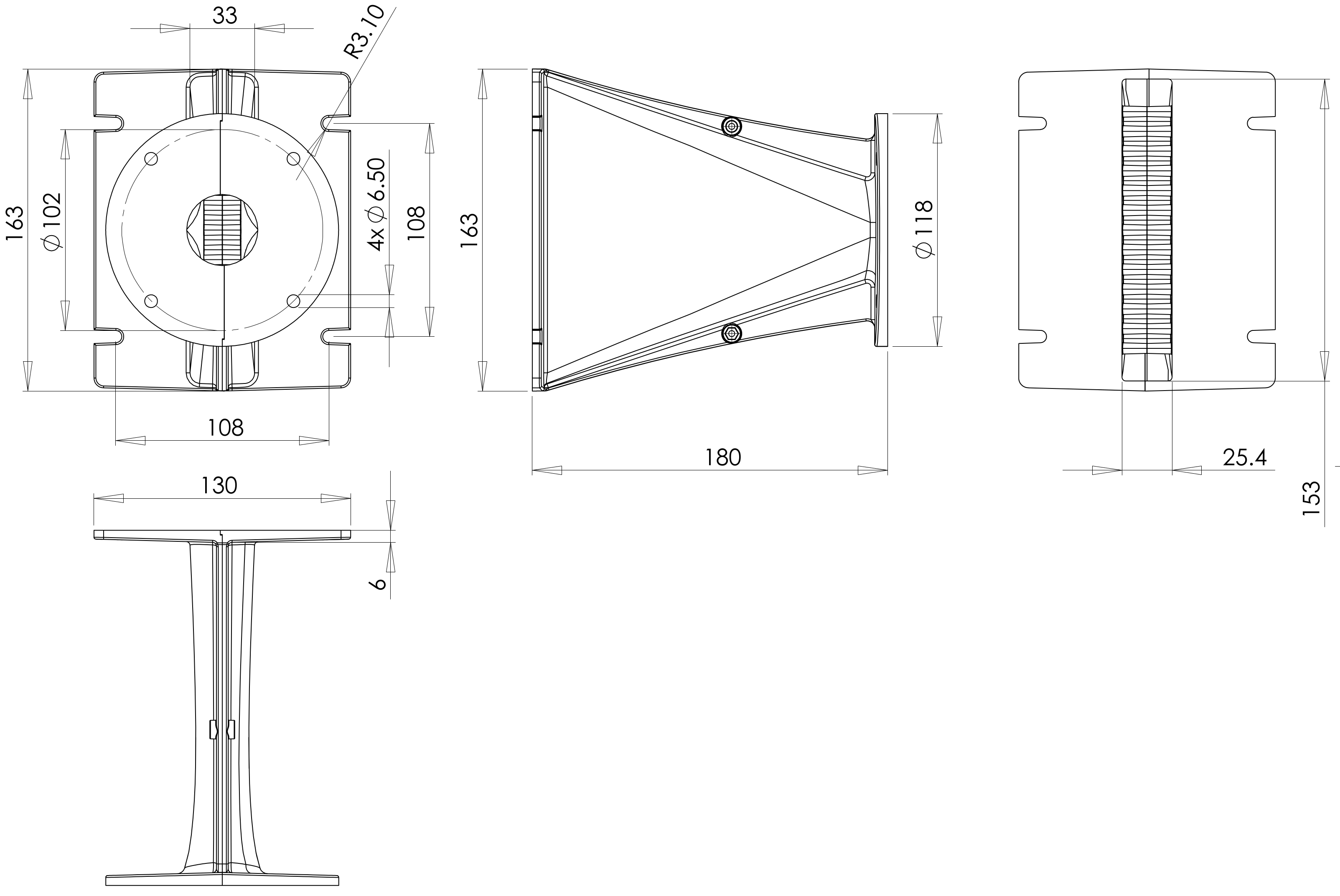 | Bohrungen | 4 × 6,5 mm (90° auf 102 mm Ø) |